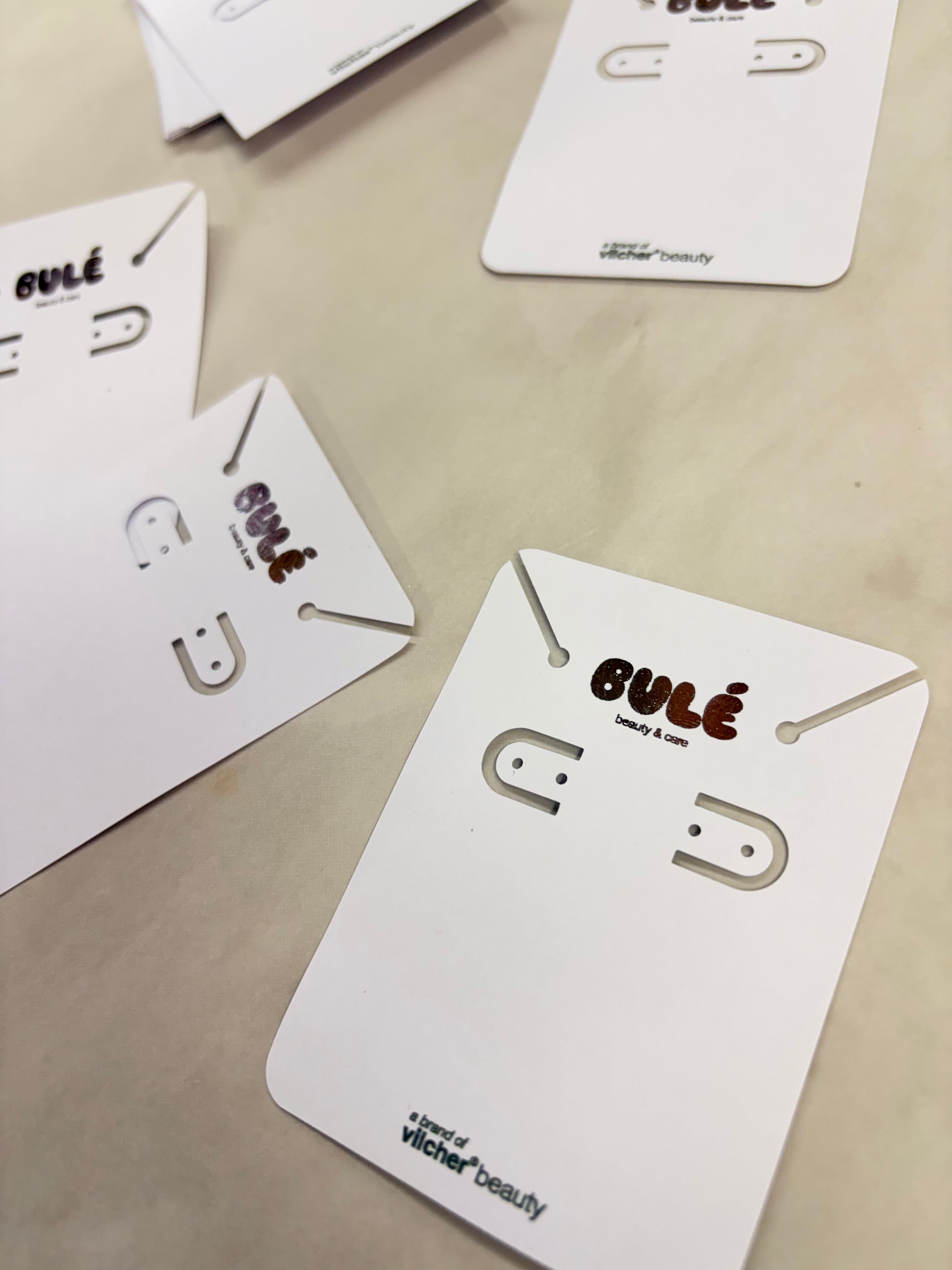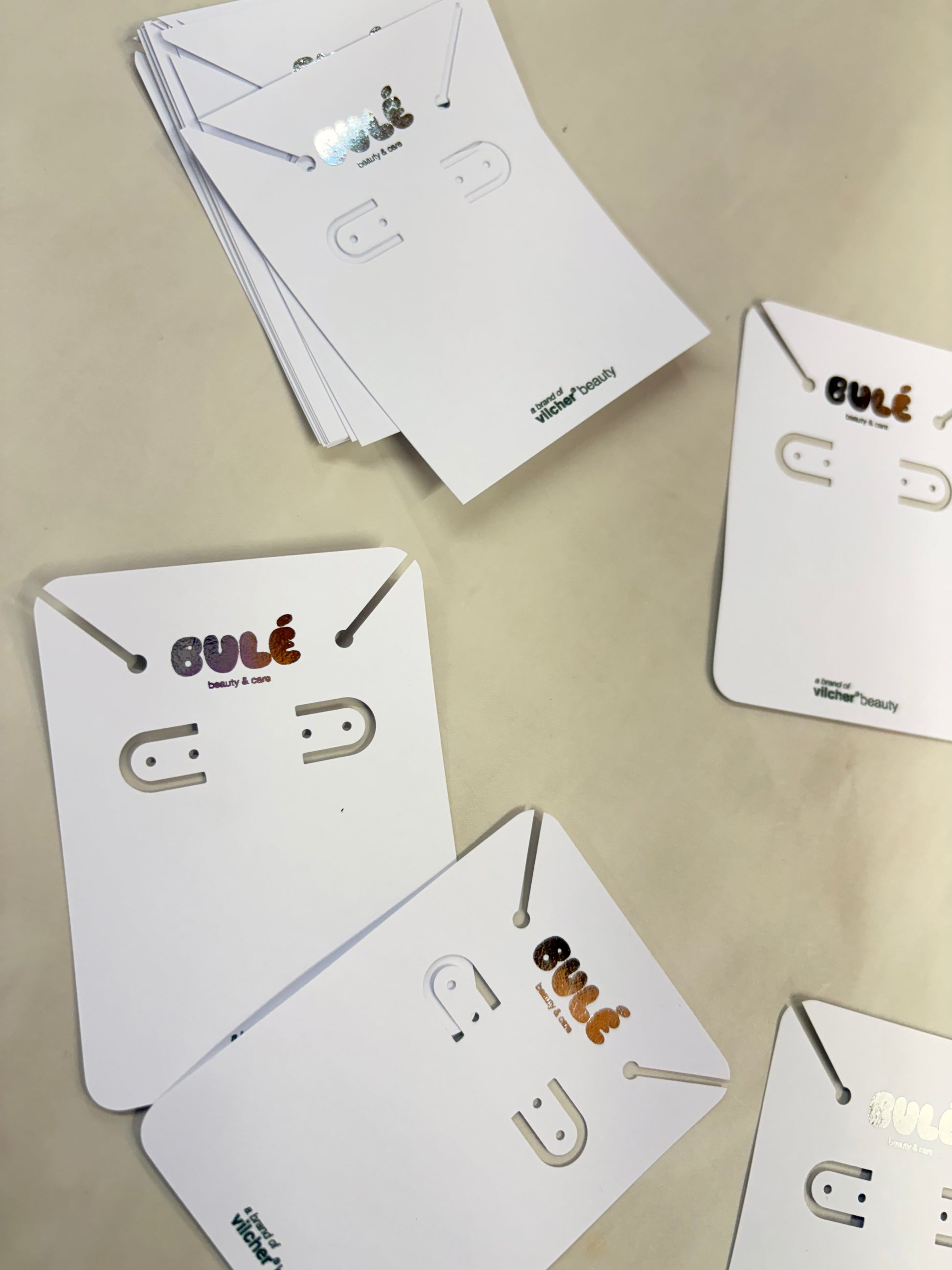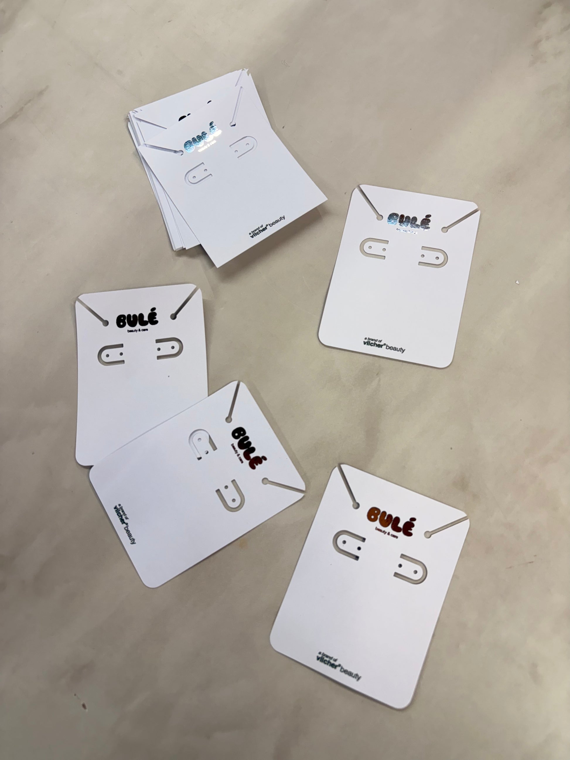 50 displays para joyería con tu logo y suaje especial para aretes y/o collar.