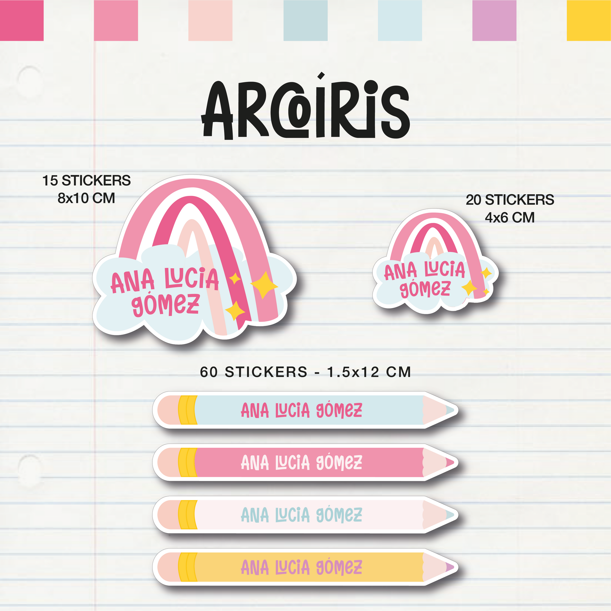 Nuestra colección de stickers personalizadas está pensada para darle vida, color y personalidad a todo lo que necesitas marcar: libretas, libros, lápices, loncheras y más.